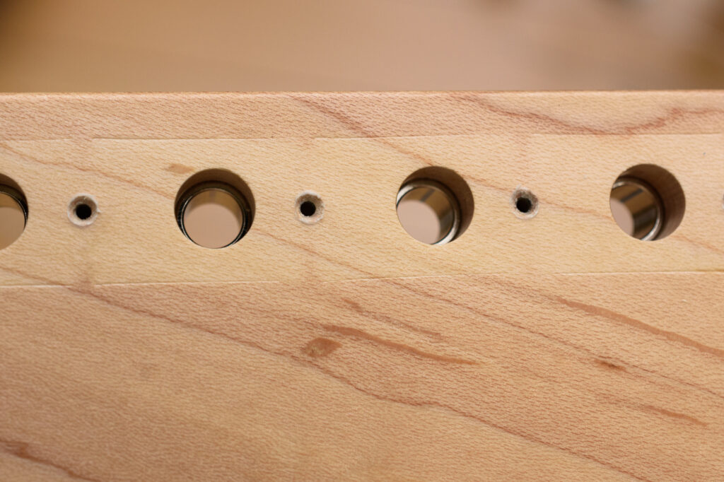 ペグを外すと、ペグの縁が当たっていた部分が少し凹んでおり、ここだけでペグが支えられて留まっているのが分かります。関係ないですが、メイプルが日焼けしていますね。もうひとつ関係ないですが、ねじ穴は面取りされています。SAITO GUITARSさん、丁寧ですね。穴もキレイ。奥にヘッド表側のブッシュが見えます。
