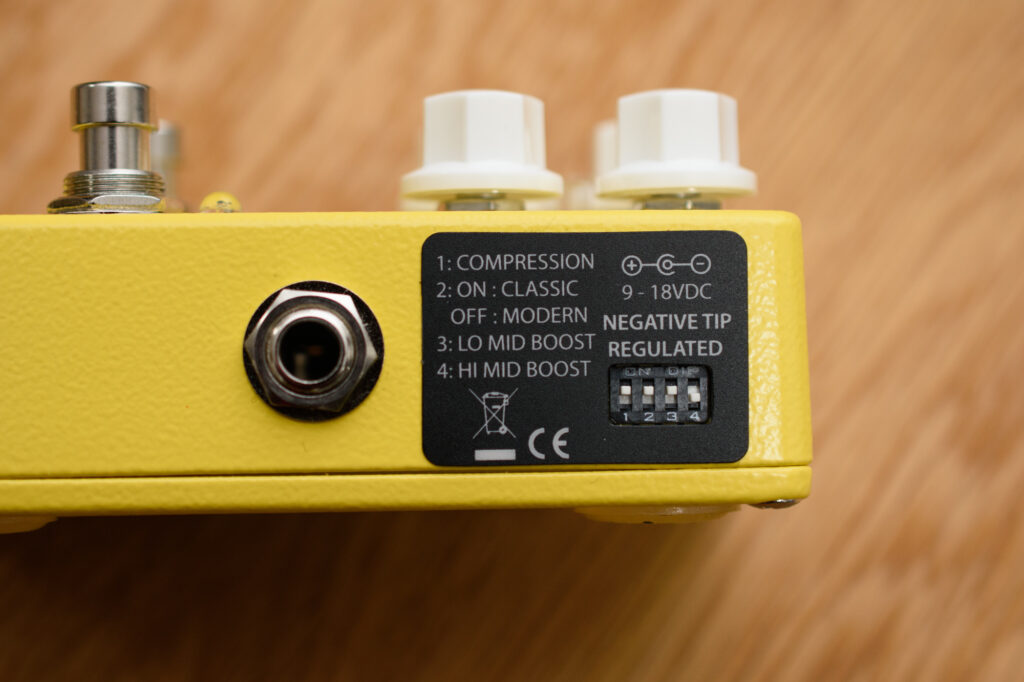 AC Booster V2は、往年の名作であるAC Boosterにフットスイッチを1つ追加し、ブーストを載せたことが大きな特徴となっています。さらに、側面にDIPスイッチが追加され、これによって基本キャラクターやコンプレッション感、帯域のバランスを変更可能となっています。